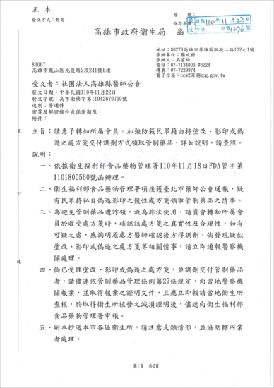 衛生福利部食品藥物管理署頃接獲臺北市藥師公會通報,疑有民眾持私自偽造影印之慢性處方箋領取管制藥品之情事。