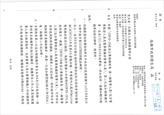 依據嚴重特殊傳染性肺炎中央流行疫情指揮中心111年6月14日肺中指字第1113700338號函辦理。
