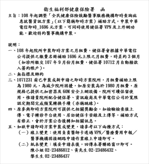 6.所以中華電信有給醫界及健保署承諾書:高於108年公告支付上限之院所(月繳6591元、5031元、3760元),明年2月28日前申請異動方案即可。明年1月、2月最多收費1980元(公告支付上限),也會有健保署全額補助。